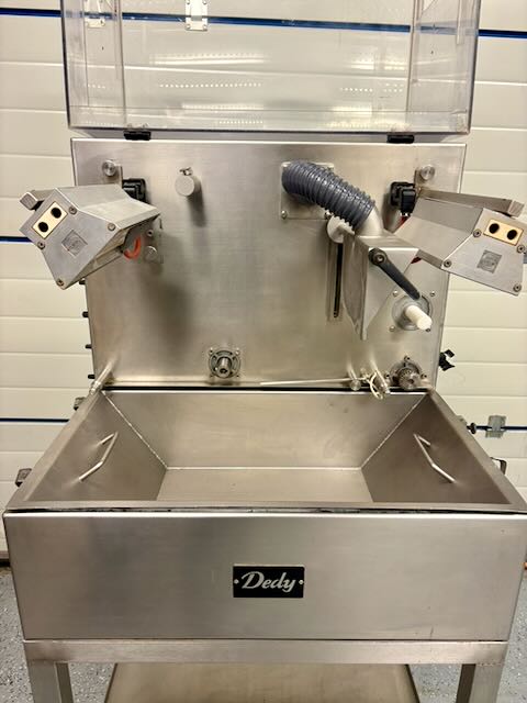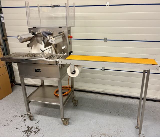 Compacte en veelzijdige overtrekmachine voor het gelijkmatig coaten van producten met chocolade, fudge of glazuur. Uitgevoerd met chocoladewiel en een bandbreedte van 220 mm.
